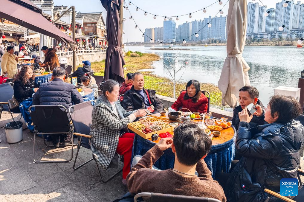 Tourists enjoy tea time at an outdoor tea house in Changde, central China's Hunan Province, Feb. 17, 2026. During this Spring Festival holiday, traditional Chinese New Year food and trendy cuisines have altogether become highlights for peoples' holiday consumption. (Xinhua/Chen Sihan)