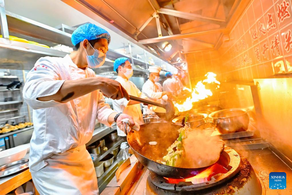 Chefs cook meals for customers at a restaurant in Binhai New Area of north China's Tianjin, Feb. 18, 2026. During this Spring Festival holiday, traditional Chinese New Year food and trendy cuisines have altogether become highlights for peoples' holiday consumption. (Photo by Du Penghui/Xinhua)