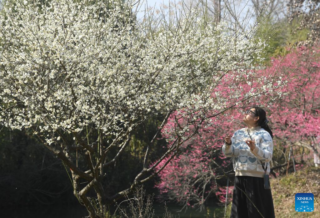 A visitor enjoys plum blossoms at the Xixi National Wetland Park in Hangzhou, east China's Zhejiang Province, Feb. 18, 2026. The Xixi wetland has entered the best season for viewing plum blossoms during the Spring Festival holiday. (Xinhua/Weng Xinyang)