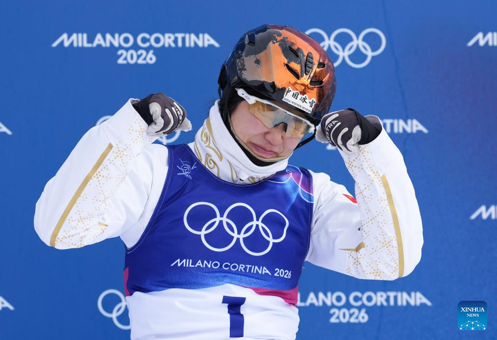 Xu Mengtao of China celebrates after the freestyle skiing women's aerials final 2 at the Milan-Cortina 2026 Olympic Winter Games in Livigno, Italy, Feb. 18, 2026. (Xinhua/Wu Huiwo)
