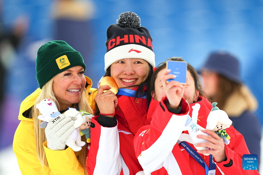 Gold medalist Xu Mengtao (C) of China, silver medalist Danielle Scott of Australia and bronze medalist Shao Qi of China pose for a selfie during the awarding ceremony for the freestyle skiing women's aerials at the Milan-Cortina 2026 Olympic Winter Games in Livigno, Italy, Feb. 18, 2026. (Xinhua/Wu Huiwo)