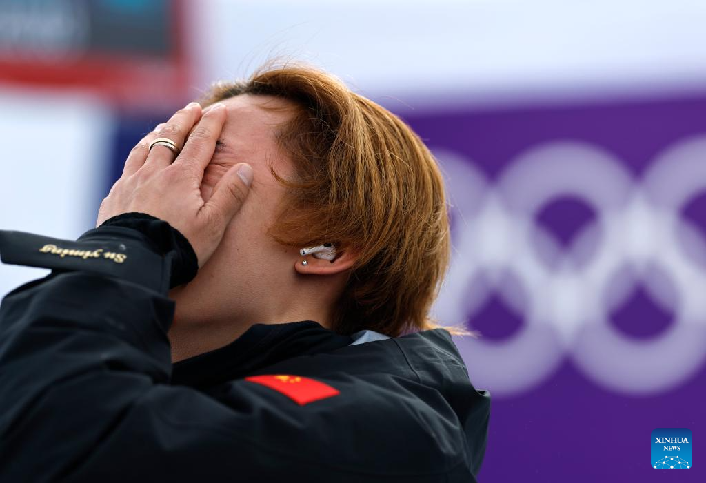 Su Yiming of China reacts during the snowboard men's snowboard slopestyle final at the Milan-Cortina 2026 Olympic Winter Games in Livigno, Italy, Feb. 18, 2026. (Xinhua/Wang Peng)