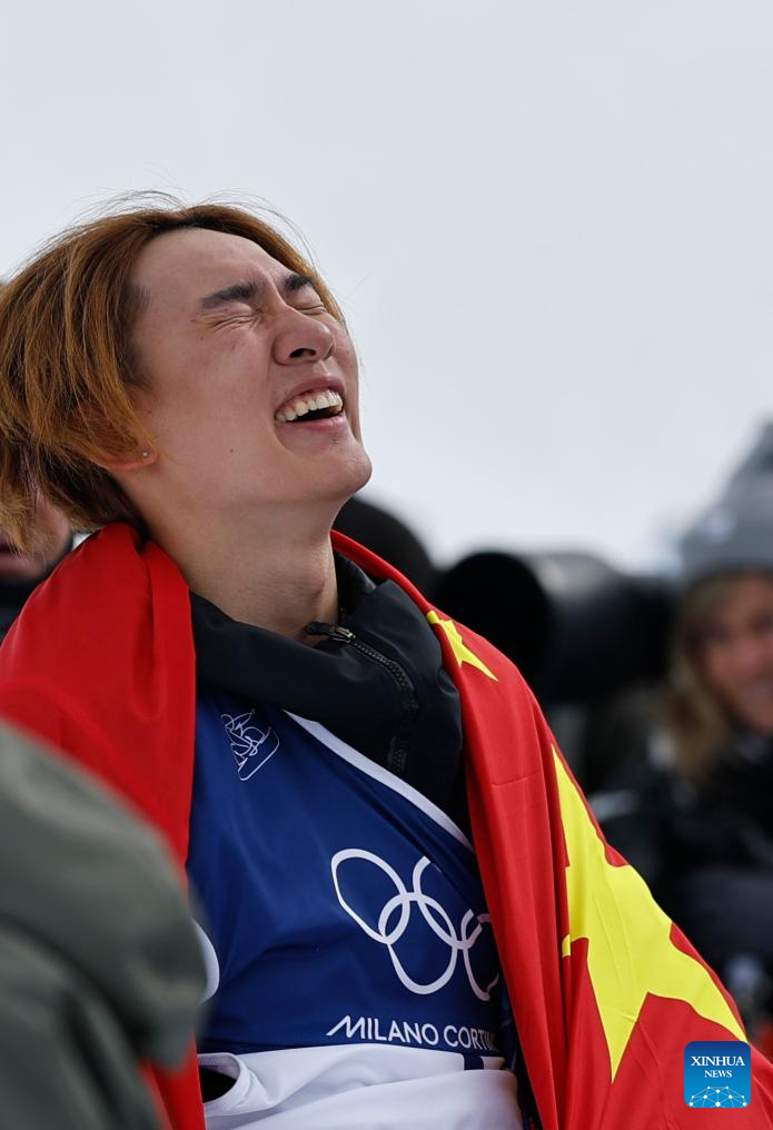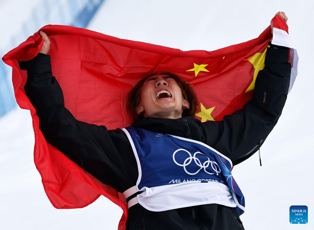 LIVIGNO, Italy, Feb. 18 (Xinhua) -- Su Yiming captured gold in the men's snowboard slopestyle final at the Milan-Cortina Winter Olympics on Wednesday, delivering the first gold medal for China at the Games.