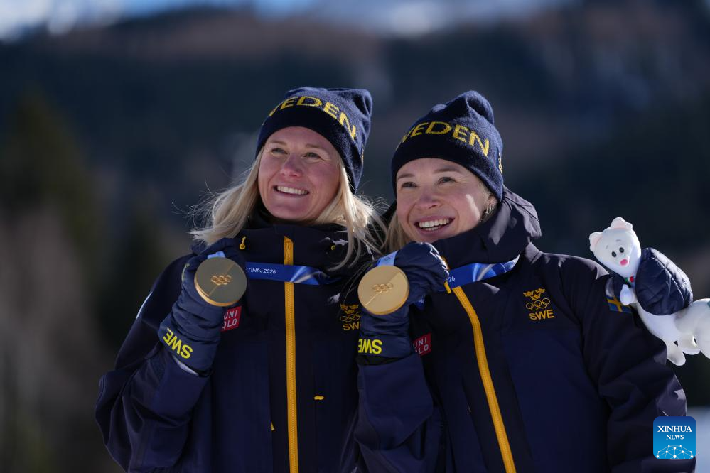Gold medalists Jonna Sundling and Maja Dahlqvist of Sweden pose during the awarding ceremony for the cross-country skiing women's team sprint free at the Milan-Cortina 2026 Olympic Winter Games in Tesero, Italy, Feb. 18, 2026. (Xinhua/Peng Ziyang)