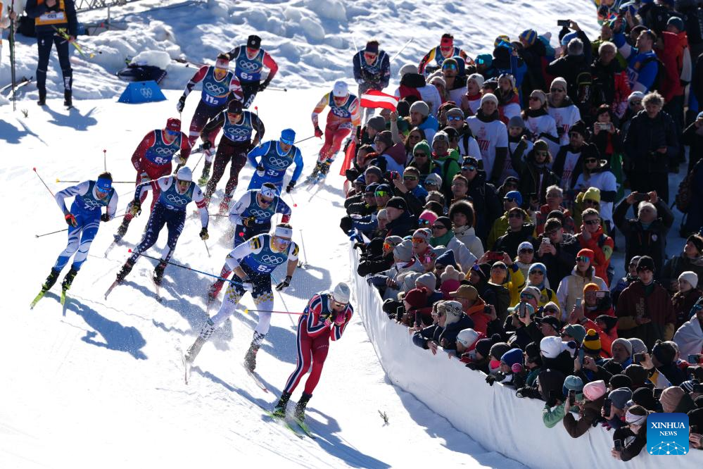 Athletes compete during the cross-country skiing men's team sprint free final at the Milan-Cortina 2026 Olympic Winter Games in Tesero, Italy, Feb. 18, 2026. (Xinhua/Peng Ziyang)