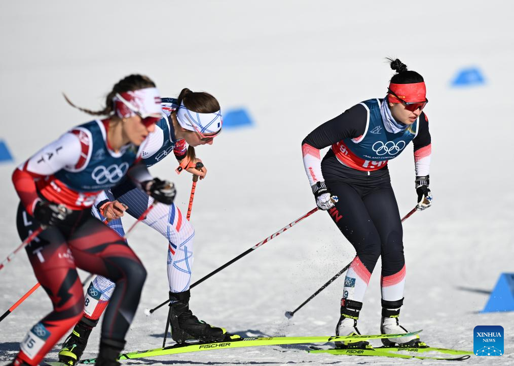 Chi Chunxue of China competes during the cross-country skiing women's team sprint free final at the Milan-Cortina 2026 Olympic Winter Games in Tesero, Italy, Feb. 18, 2026. (Xinhua/Peng Ziyang)