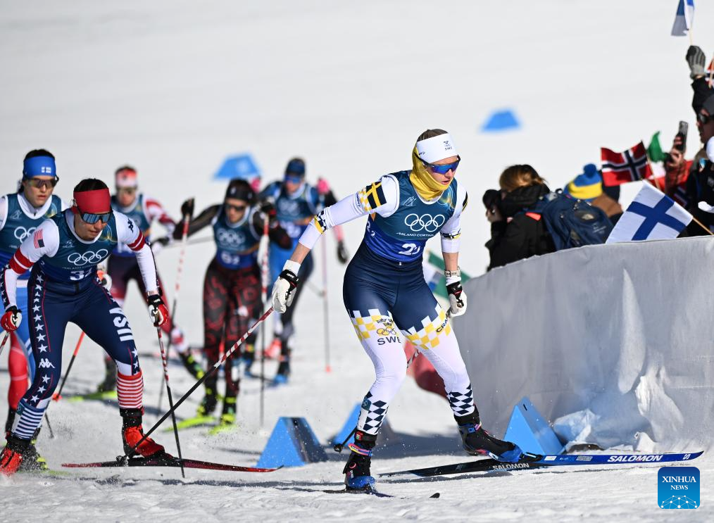 Jonna Sundling of Sweden competes during the cross-country skiing women's team sprint free final at the Milan-Cortina 2026 Olympic Winter Games in Tesero, Italy, Feb. 18, 2026. (Xinhua/Peng Ziyang)