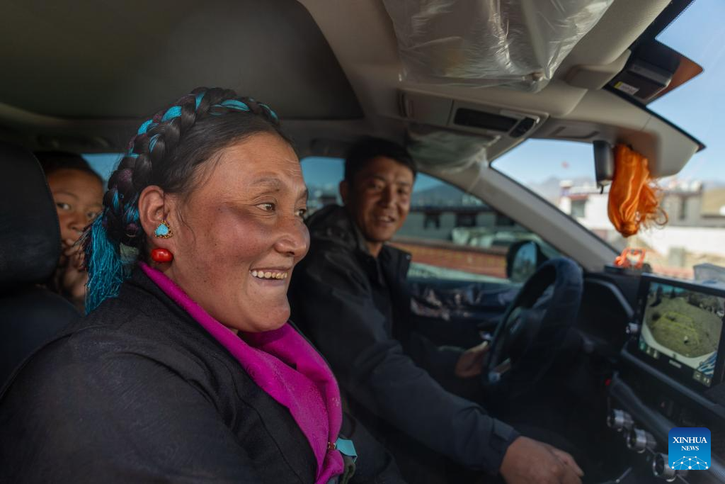 Sangs-rgyas (R) drives to buy New Year goods with his wife Drolma Tsering (C) and his daughter Tenzin Kelyang in Gurum Village of Chamco Township, Dingri County, southwest China's Xizang Autonomous Region, Feb. 16, 2026.