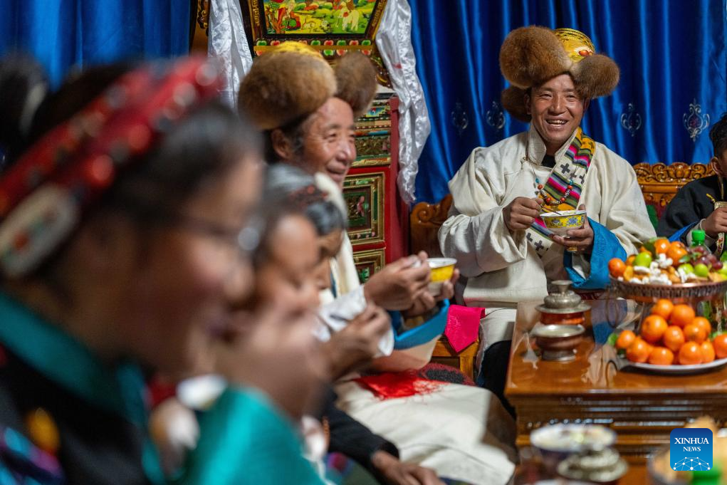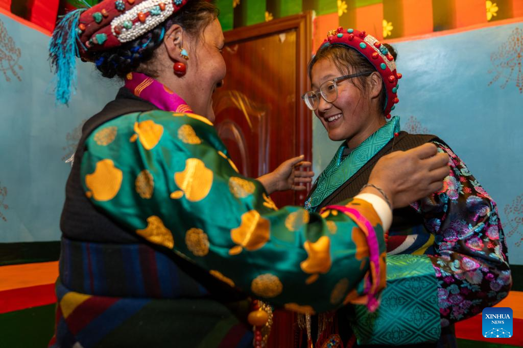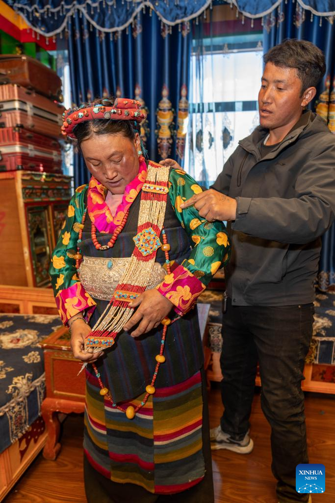 Sangs-rgyas (R) helps his wife Drolma Tsering wear accessories at home in Gurum Village of Chamco Township, Dingri County, southwest China's Xizang Autonomous Region, Feb. 16, 2026.