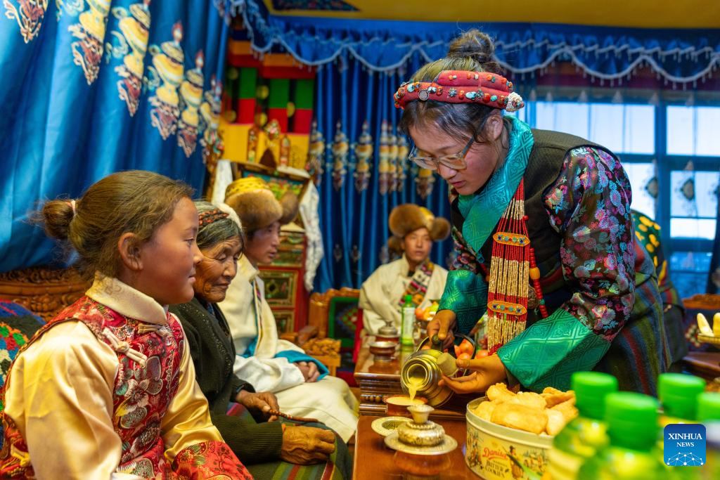Tenzin Wangmo (1st, R) serves tea for her grandma Tsering Tarchok at home in Gurum Village of Chamco Township, Dingri County, southwest China's Xizang Autonomous Region, Feb. 16, 2026.