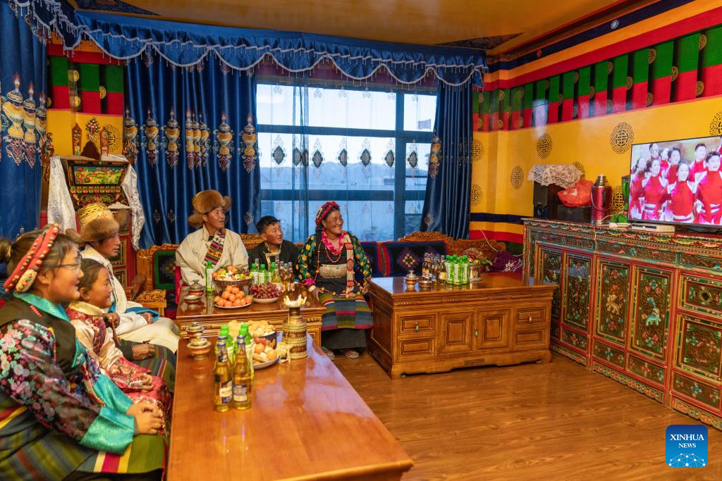 The family of Sangs-rgyas watches the China Central Television's "Spring Festival Gala" at home in Gurum Village of Chamco Township, Dingri County, southwest China's Xizang Autonomous Region, Feb. 16, 2026.