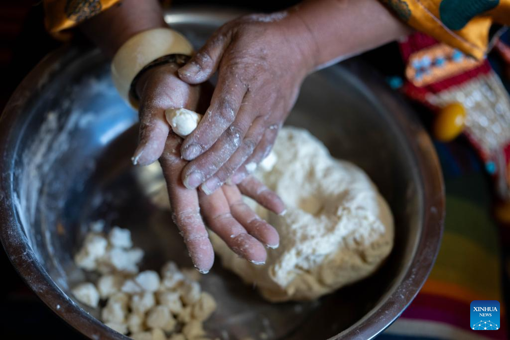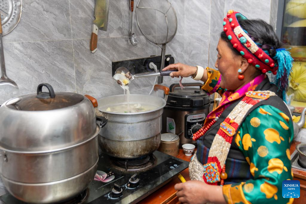 Drolma Tsering makes "gutu," a kind of soup made of flour, at home in Gurum Village of Chamco Township, Dingri County, southwest China's Xizang Autonomous Region, Feb. 16, 2026. "Gu" in Tibetan means nine and "Tu" means pasta. At the Night of Gutu, the whole family and relatives gather to enjoy the dish and celebrate the occasion.