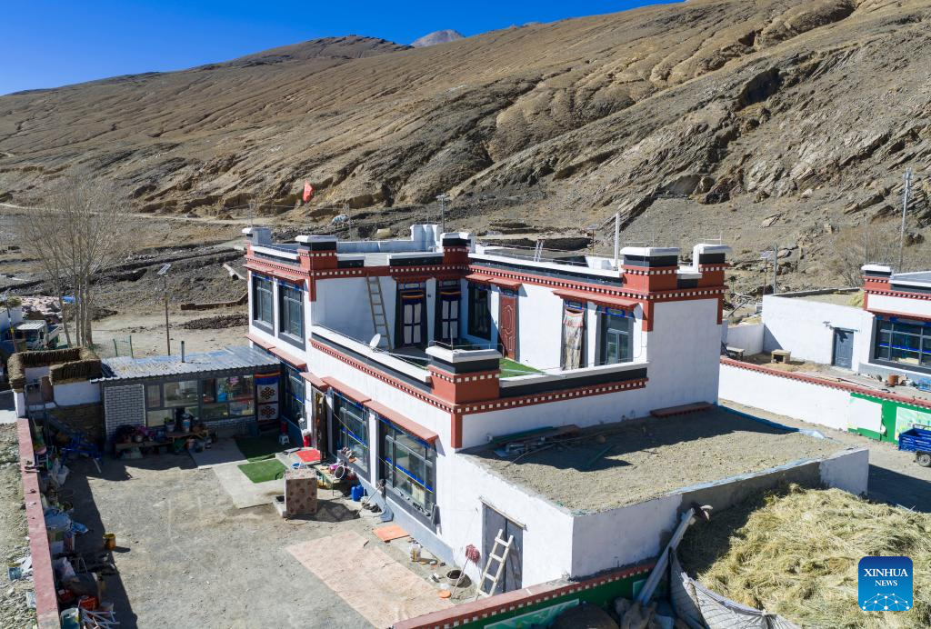 A drone photo taken on Feb. 16, 2026 shows a view of the house of Sangs-rgyas in Gurum Village of Chamco Township, Dingri County, southwest China's Xizang Autonomous Region.