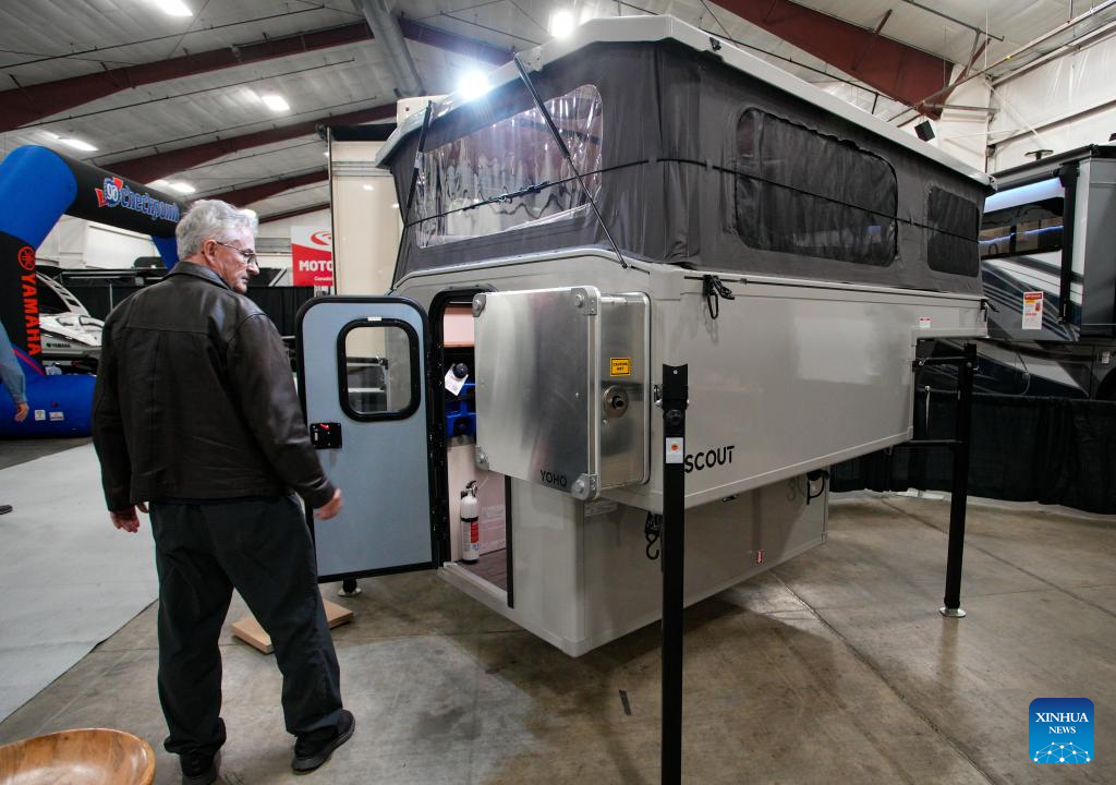 A man looks at a pop-up camper at the 2026 Earlybird RV (recreational vehicles) Show & Sale in Abbotsford, British Columbia, Canada, on Feb. 19, 2026. The four-day event kicked off here on Thursday. (Photo by Liang Sen/Xinhua)