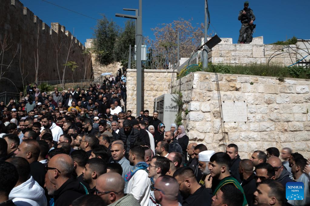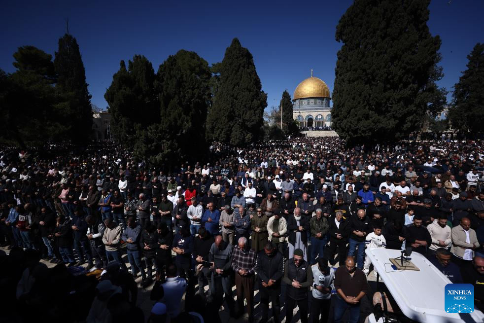 Worshippers gather for the first Friday prayers of the holy month of Ramadan at the Al-Aqsa Mosque compound in the Old City of Jerusalem, Feb. 20, 2026. Israeli authorities tightened security in Jerusalem on the first Friday of Ramadan, capping West Bank worshippers' access to the Al-Aqsa Mosque compound at 10000. (Photo by Jamal Awad/Xinhua)