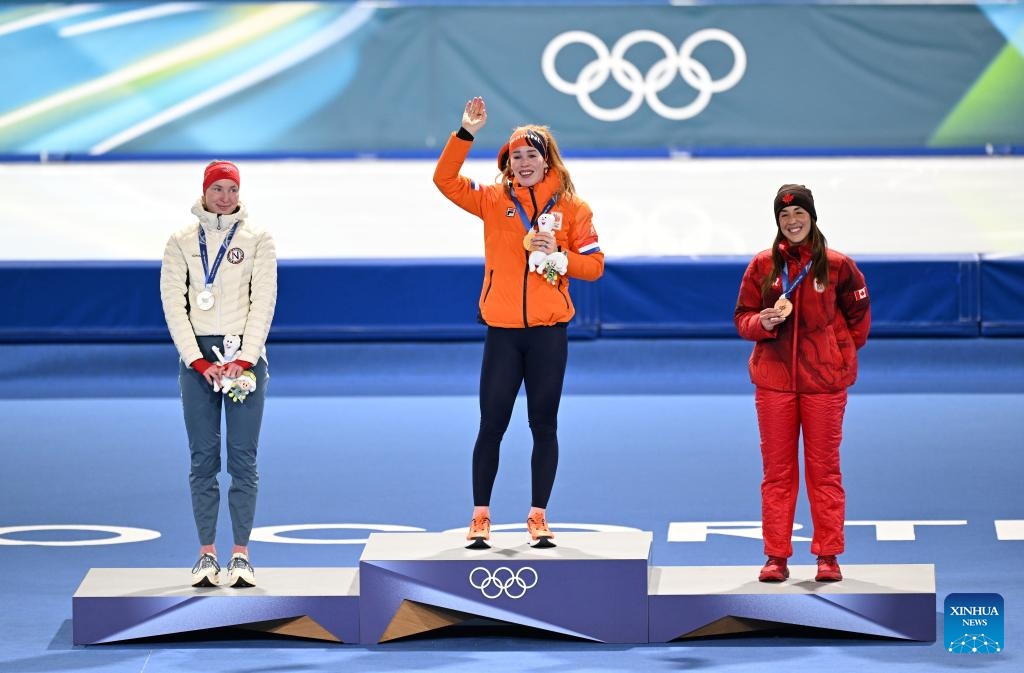 Gold medalist Antoinette Rijpma-de Jong (C) of the Netherlands, silver medalist Ragne Wiklund (L) of Norway, and bronze medalist Valerie Maltais of Canada attend the awarding ceremony of the speed skating women's 1500m event at the Milan-Cortina 2026 Olympic Winter Games in Milan, Italy, Feb. 20, 2026. (Xinhua/Wu Wei)