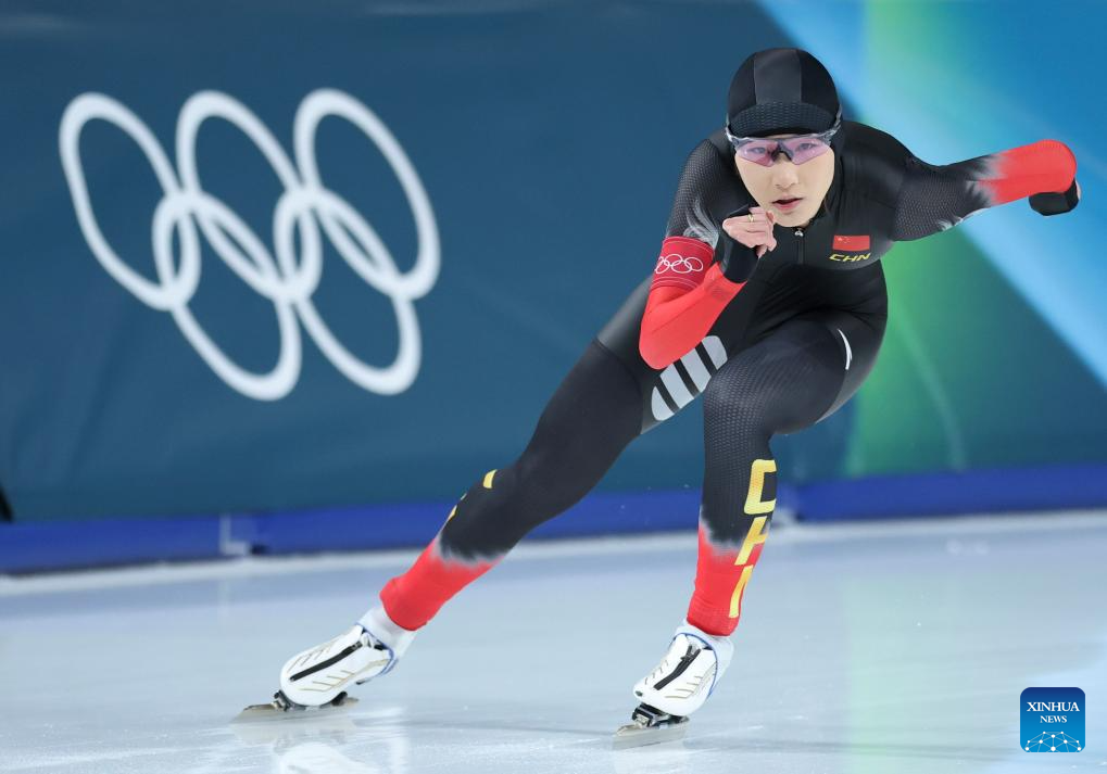Yin Qi of China competes during the speed skating women's 1500m event at the Milan-Cortina 2026 Olympic Winter Games in Milan, Italy, Feb. 20, 2026. (Xinhua/Li Jing)
