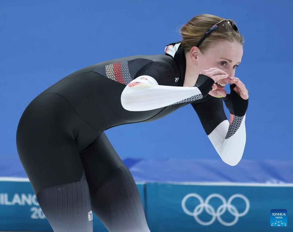 Lea Sophie Scholz of Germany reacts after the speed skating women's 1500m event at the Milan-Cortina 2026 Olympic Winter Games in Milan, Italy, Feb. 20, 2026. (Xinhua/Li Jing)