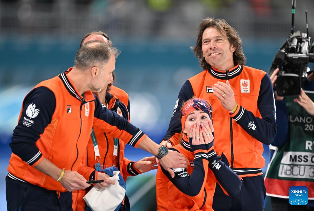 Antoinette Rijpma-de Jong (2nd R) of the Netherlands reacts after winning the speed skating women's 1500m event at the Milan-Cortina 2026 Olympic Winter Games in Milan, Italy, Feb. 20, 2026. (Xinhua/Wu Wei)