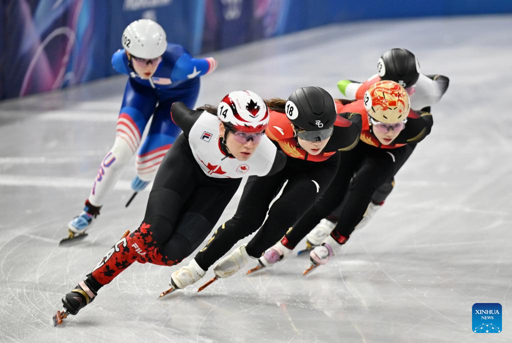 Gong Li (C) and Yang Jingru (2nd R) of China compete during the short track speed skating women's 1500m quarterfinal at the Milan-Cortina 2026 Olympic Winter Games in Milan, Italy, Feb. 20, 2026. (Xinhua/Cheng Min)