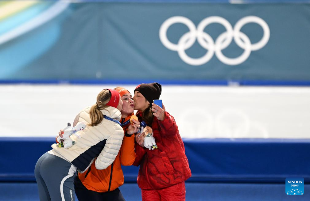 Silver medalist Ragne Wiklund (L) of Norway and bronze medalist Valerie Maltais (R) of Canada kiss gold medalist Antoinette Rijpma-de Jong of the Netherlands during the awarding ceremony of the speed skating women's 1500m event at the Milan-Cortina 2026 Olympic Winter Games in Milan, Italy, Feb. 20, 2026. (Xinhua/Wu Wei)
