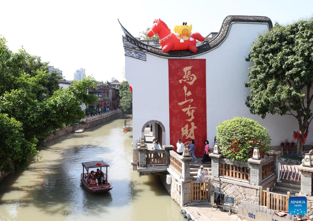 People take a boat tour at the Shangxiahang traditional block in Fuzhou, southeast China's Fujian Province, Feb. 21, 2026. Many visitors flocked to historic blocks in Fuzhou to celebrate the Chinese New Year during the Spring Festival holiday. (Xinhua/Jiang Kehong)
