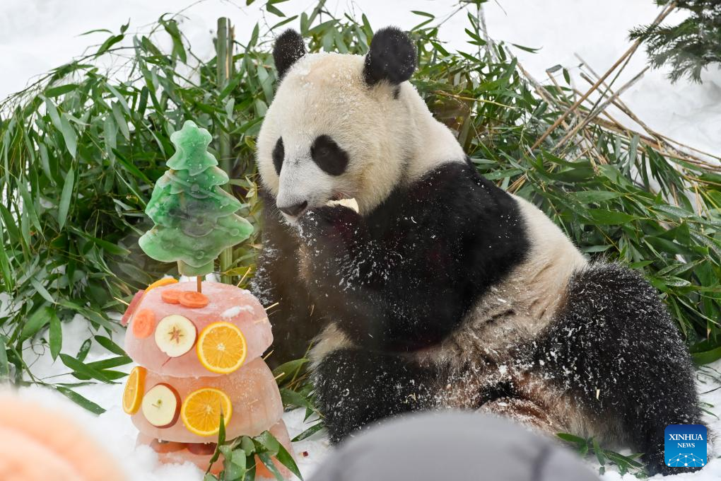 Giant panda Katyusha enjoys the ice cake during an event celebrating the Chinese Lunar New Year at the Moscow Zoo in Moscow, Russia, Feb. 21, 2026. (Photo by Alexander Zemlianichenko Jr/Xinhua)