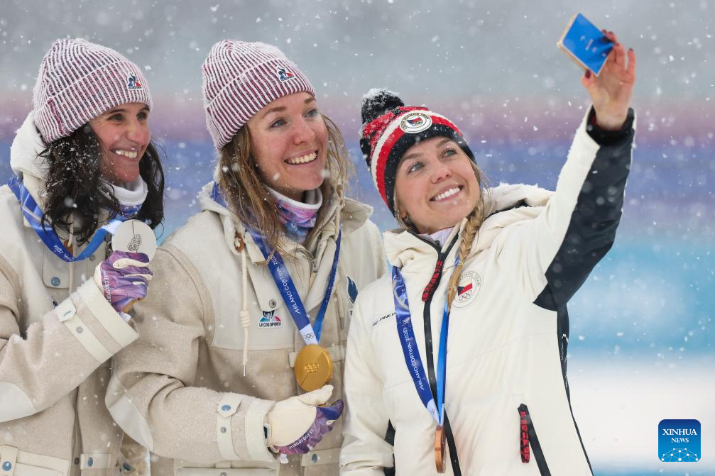 Gold medalists Oceane Michelon (C) of France, silver medalist Julia Simon (L) of France and bronze medalists Tereza Vobornikova of the Czech Republic take a selfie during the awarding ceremony of the biathlon women's 12.5km mass start event at the 2026 Milan-Cortina Winter Olympics in Anterselva, Italy, Feb. 21, 2026. (Xinhua/Zhang Tao)