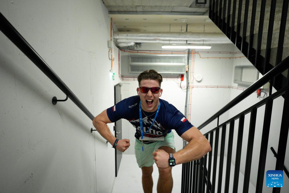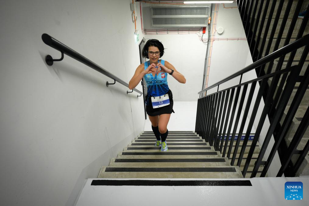 A participant climbs the stairs inside the Skyliner building during the Skyliner Everest Run 2026 in Warsaw, Poland on Feb. 21, 2026. The event requires competitors to ascend the 42-floor staircase 55 times within 24 hours, reaching a cumulative height equivalent to the world's highest peak, Mount Qomolangma. (Photo by Jaap Arriens/Xinhua)