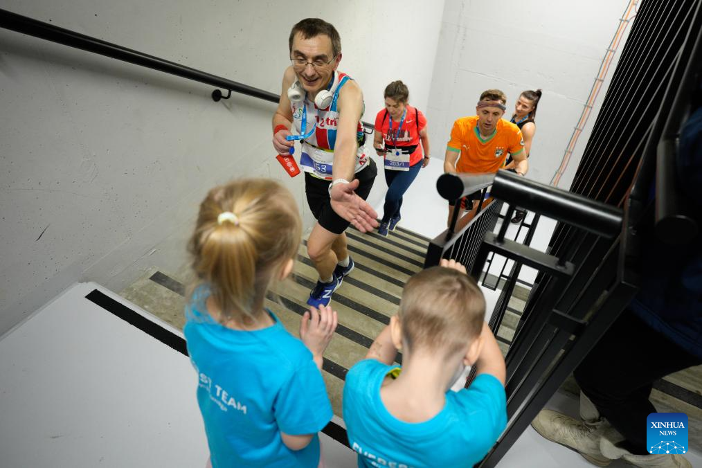 Participants climb the stairs inside the Skyliner building during the Skyliner Everest Run 2026 in Warsaw, Poland on Feb. 21, 2026. The event requires competitors to ascend the 42-floor staircase 55 times within 24 hours, reaching a cumulative height equivalent to the world's highest peak, Mount Qomolangma. (Photo by Jaap Arriens/Xinhua)