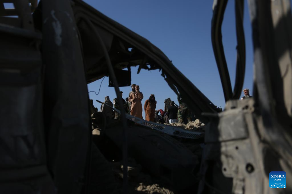 A damaged vehicle is pictured following an airstrike in Afghanistan's Nangarhar Province, on Feb. 22, 2026. Zabihullah Mujahid, spokesperson for the Afghan government, confirmed on X on Sunday that the Pakistani military had once again carried out airstrikes on border areas between Afghanistan and Pakistan, causing dozens of casualties. (Photo by Saifurahman Safi/Xinhua)