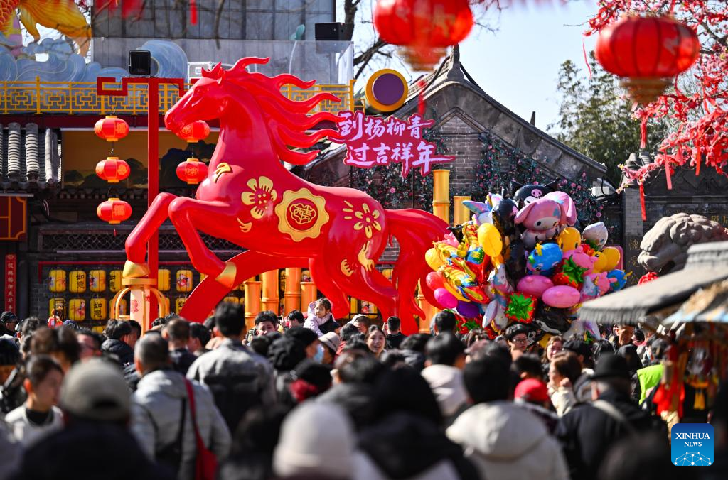 Visitors watch a show at Yangliuqing ancient town in Tianjin, north China, Feb. 22, 2026. Yangliuqing ancient town launched a range of activities featuring folk customs, traditional culture and interactive experiences, offering visitors an immersive folk feast during this Spring Festival holiday. (Xinhua/Zhao Zishuo)