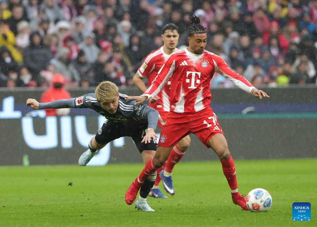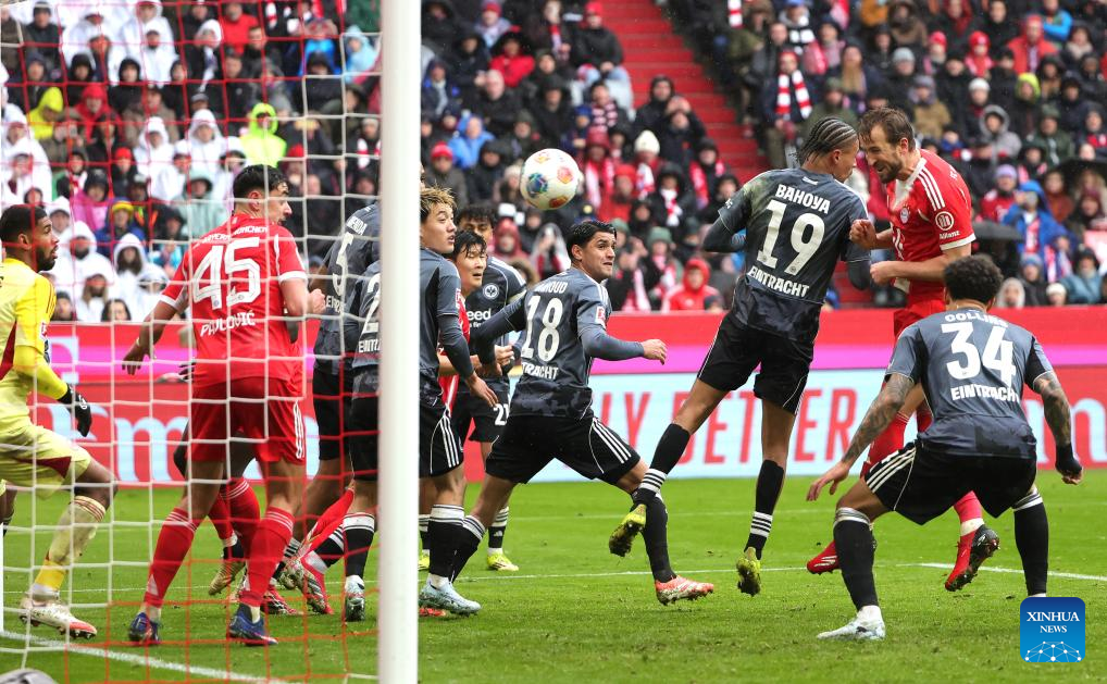 BERLIN, Feb. 21 (Xinhua) -- FC Bayern Munich survived a tense finish to secure a 3-2 home win over Eintracht Frankfurt and maintains its lead at the top of the Bundesliga on Saturday.