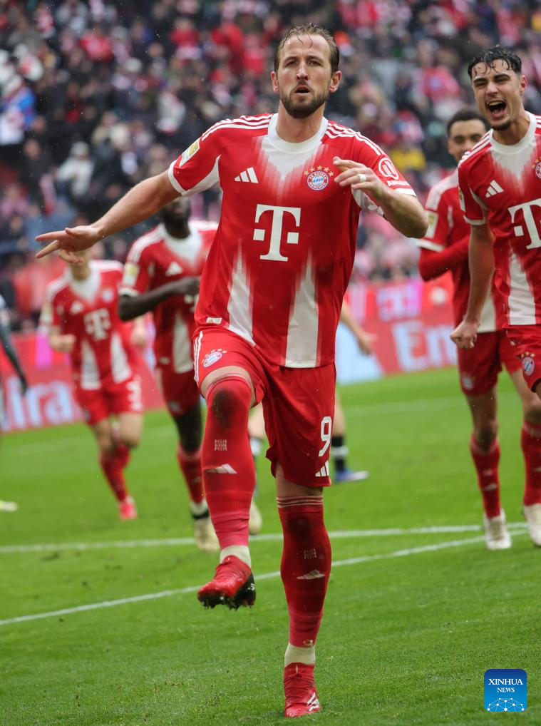 Harry Kane (front) of FC Bayern Munich celebrates scoring during the German first division Bundesliga football match between FC Bayern Munich and Eintracht Frankfurt in Munich, Germany, Feb. 21, 2026. (Photo by Philippe Ruiz/Xinhua)
