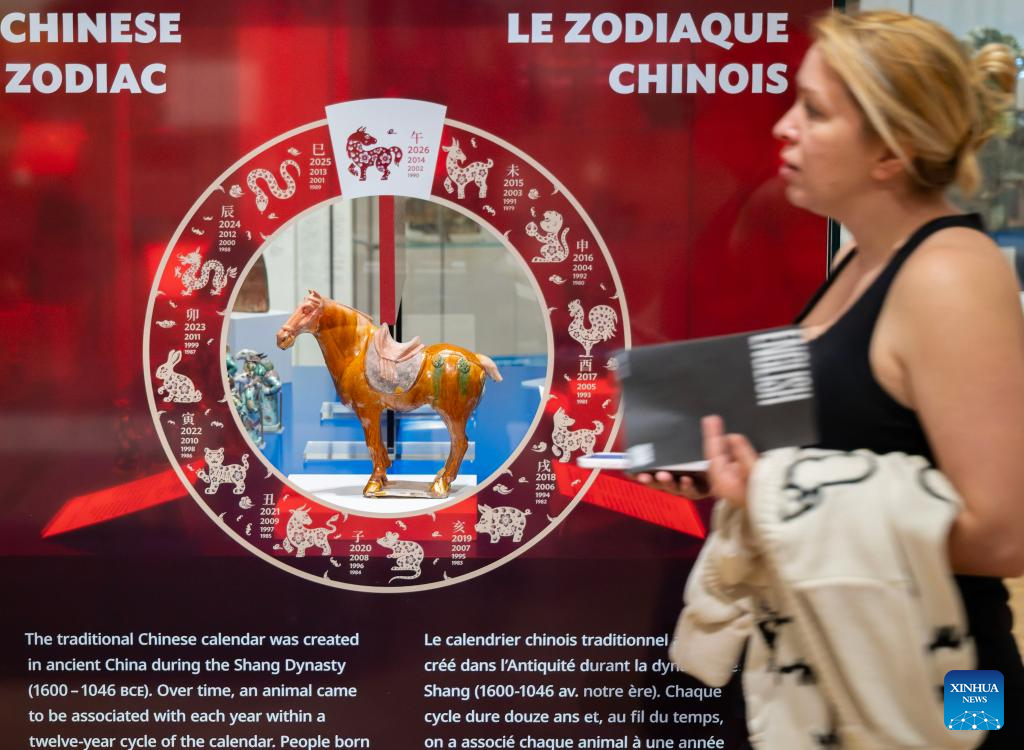 A visitor walks past an exhibit of the Year of the Horse from the Chinese Zodiac Case exhibition at the Royal Ontario Museum in Toronto, Canada, on Feb. 21, 2026. Featuring a rich collection of horse-themed objects and cultural artifacts, this annual Chinese zodiac exhibition opened here on Feb. 10 and will last until Jan. 31, 2027. (Photo by Zou Zheng/Xinhua)