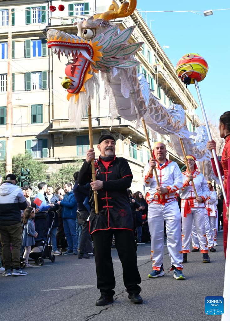 People perform lion dance during a Chinese New Year parade in Rome, Italy, Feb. 22, 2026. (Photo by Elisa Lingria/Xinhua)