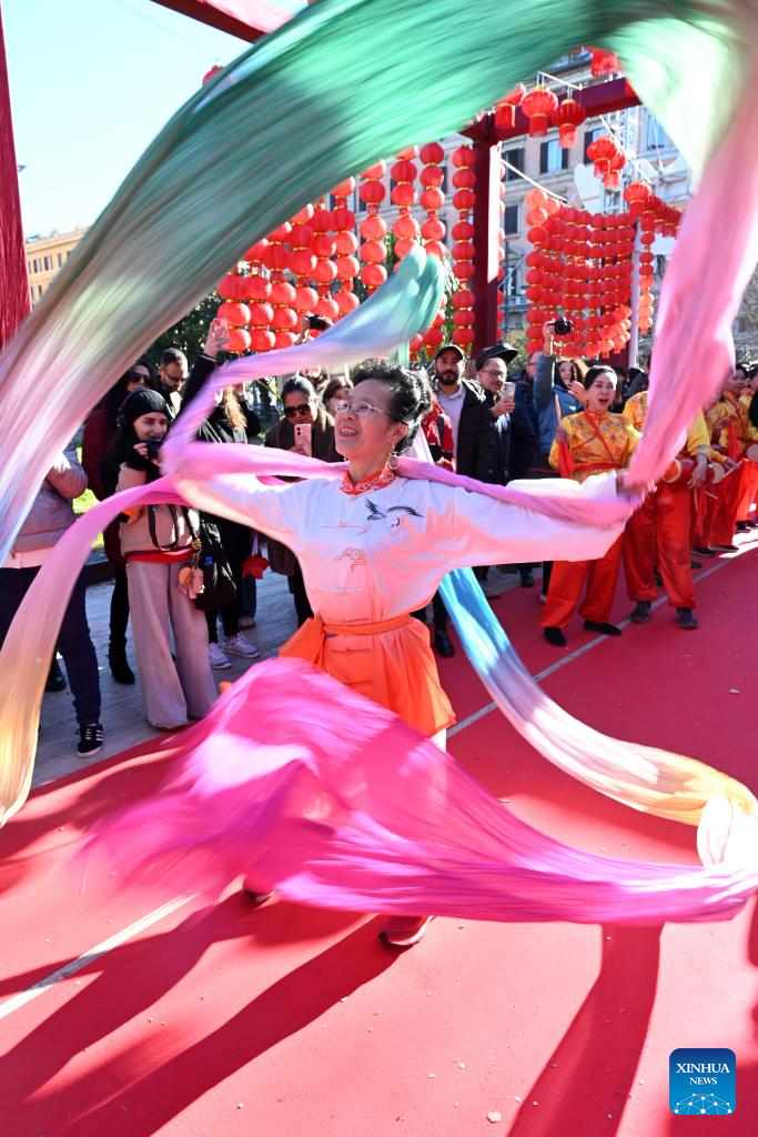 A woman performs during a Chinese New Year parade in Rome, Italy, Feb. 22, 2026. (Photo by Elisa Lingria/Xinhua)