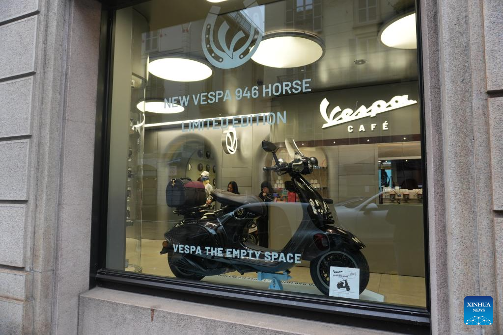 The Year of the Horse limited edition of Italian scooter brand Vespa is seen in the front window of the brand's experience space in Milan, Italy, Feb. 19, 2026. (Xinhua/Zhang Xinwen)