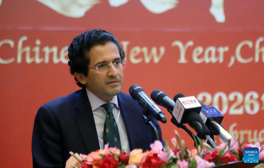 Pakistani Minister for Petroleum Ali Pervaiz Malik speaks during a Spring Festival celebration in Islamabad, capital of Pakistan on Feb. 21, 2026. (Xinhua/Zhang Jingyao)