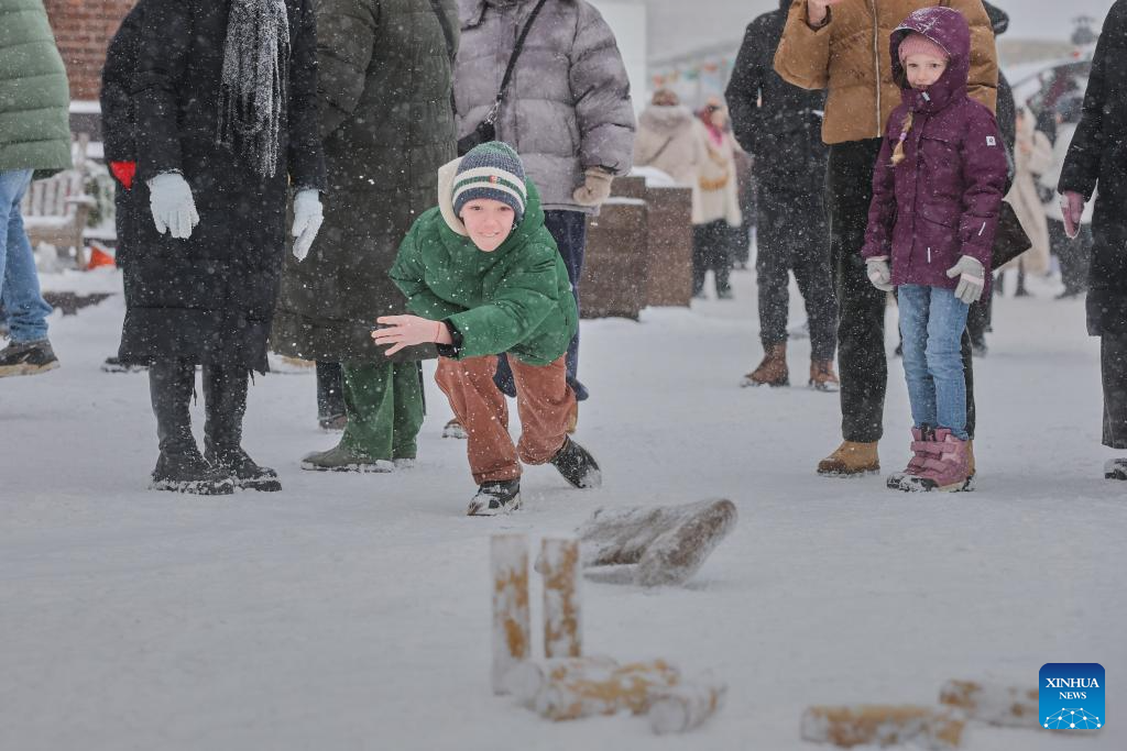 A boy plays a traditional game during Maslenitsa celebrations in St. Petersburg, Russia, on Feb. 22, 2026. Various events were held in St. Petersburg on Sunday to celebrate the traditional festival Maslenitsa. During the festival, people took part in a wide range of activities to bid farewell to the cold winter and welcome the arrival of spring. (Photo by Irina Motina/Xinhua)