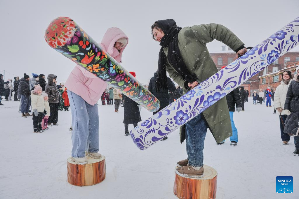 People play a traditional game during Maslenitsa celebrations in St. Petersburg, Russia, on Feb. 22, 2026. Various events were held in St. Petersburg on Sunday to celebrate the traditional festival Maslenitsa. During the festival, people took part in a wide range of activities to bid farewell to the cold winter and welcome the arrival of spring. (Photo by Irina Motina/Xinhua)