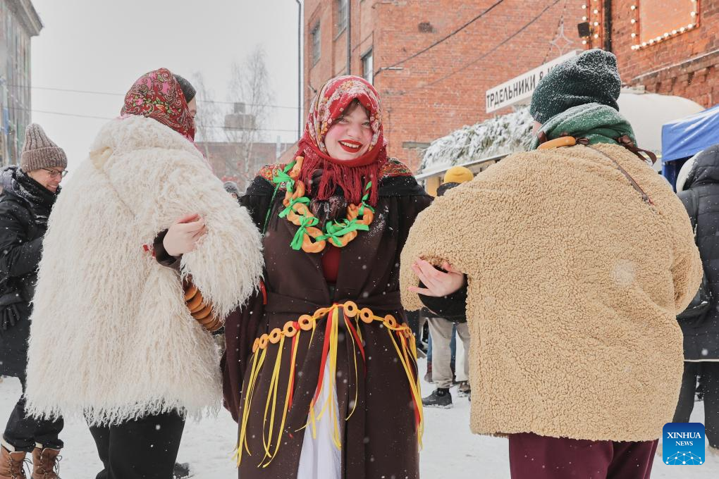 People participate in a traditional circle dance during Maslenitsa celebrations in St. Petersburg, Russia, on Feb. 22, 2026. Various events were held in St. Petersburg on Sunday to celebrate the traditional festival Maslenitsa. During the festival, people took part in a wide range of activities to bid farewell to the cold winter and welcome the arrival of spring. (Photo by Irina Motina/Xinhua)