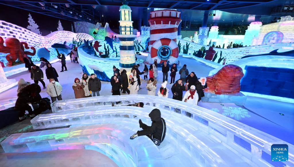 Tourists have fun at the indoor ice-and-snow theme park in the Harbin Ice and Snow World in Harbin, northeast China's Heilongjiang Province, Feb. 22, 2026. The indoor ice-and-snow theme park, a facility located within Harbin Ice-Snow World, opened on Sunday as the outdoor Harbin Ice-Snow World officially closed its 27th edition on Saturday. (Photo by Liu Yang/Xinhua)