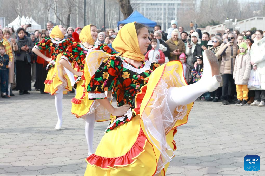 Performers dance during Maslenitsa celebrations in Bishkek, Kyrgyzstan, on Feb. 22, 2026. Maslenitsa is a traditional holiday to celebrate the beginning of spring. (Photo by Roman/Xinhua)