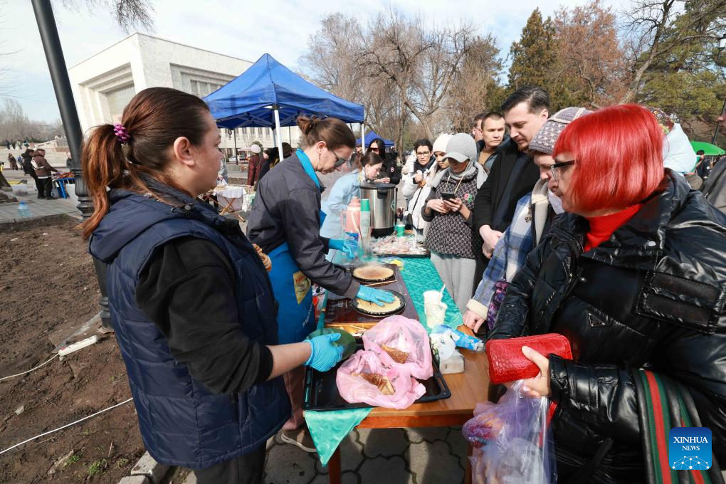 People prepare pancakes during Maslenitsa celebrations in Bishkek, Kyrgyzstan, on Feb. 22, 2026. Maslenitsa is a traditional holiday to celebrate the beginning of spring. (Photo by Roman/Xinhua)