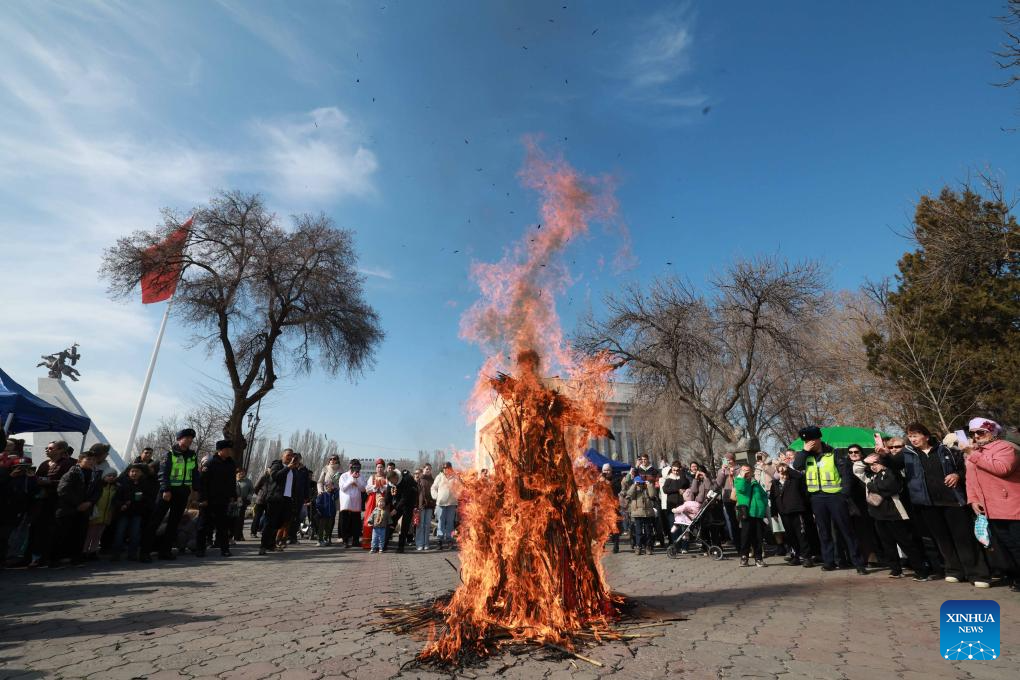 People burn a scarecrow during Maslenitsa celebrations in Bishkek, Kyrgyzstan, on Feb. 22, 2026. Maslenitsa is a traditional holiday to celebrate the beginning of spring. (Photo by Roman/Xinhua)