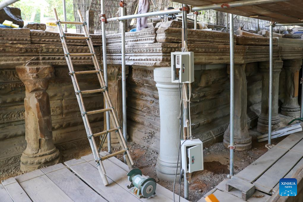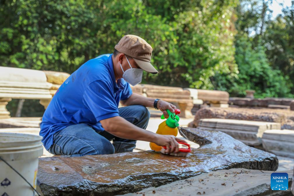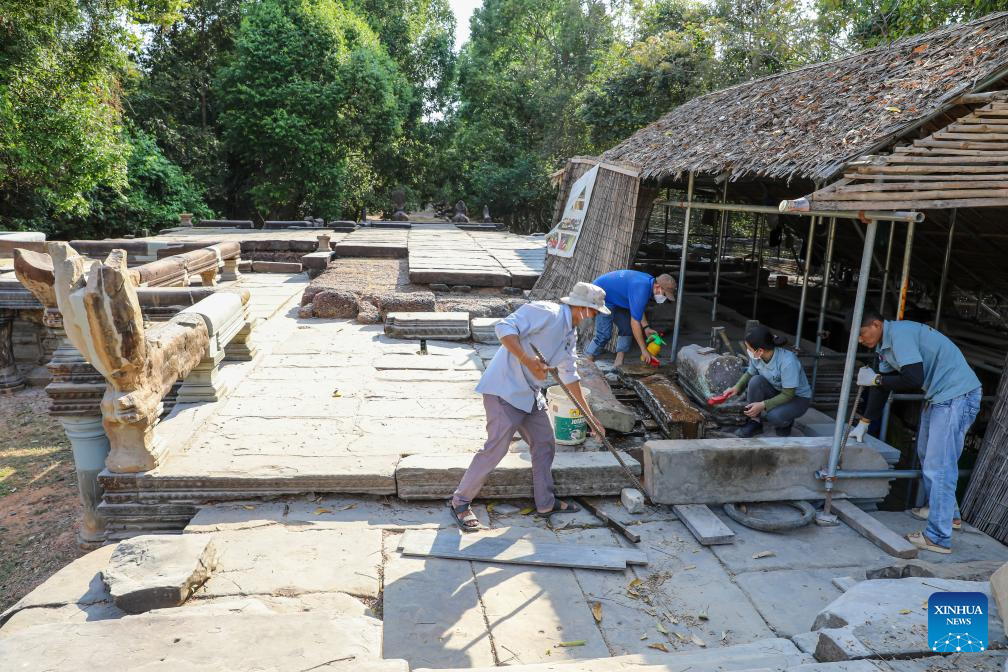A staff member works at the restoration site of ruined Naga balustrades of Banteay Samre temple in Siem Reap province, Cambodia, Feb. 17, 2026. Archaeologists have been undertaking the restoration of the Naga balustrades on the east terrace of Banteay Samre temple in Cambodia's famed Angkor Archaeological Park, the APSARA National Authority (ANA) said in a news release on Tuesday. (ANA/Handout via Xinhua)