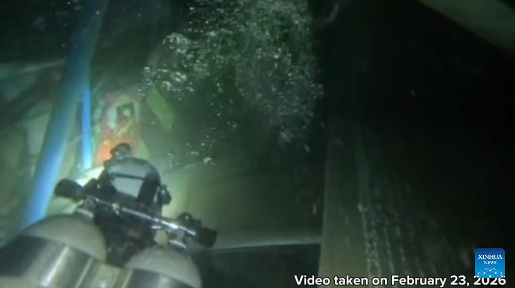 This screenshot shows a Philippine Coast Guard (PCG) diver working in waters near Baluk-Baluk Island in Basilan, the Philippines, Feb. 23, 2026. The PCG on Tuesday said it has completed a full underwater search of passenger ferry MV Trisha Kerstin 3, which sank off Basilan province on Jan. 26, leaving at least 65 people dead. (PCG/Handout via Xinhua)