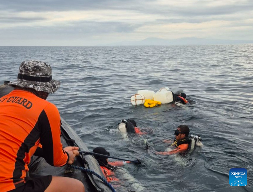 The Philippine Coast Guard (PCG) divers work in the waters near Baluk-Baluk Island in Basilan, the Philippines, Feb. 22, 2026. The PCG on Tuesday said it has completed a full underwater search of passenger ferry MV Trisha Kerstin 3, which sank off Basilan province on Jan. 26, leaving at least 65 people dead. (PCG/Handout via Xinhua)