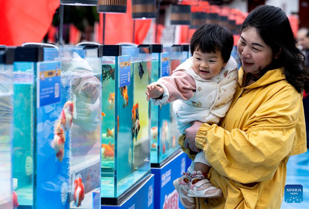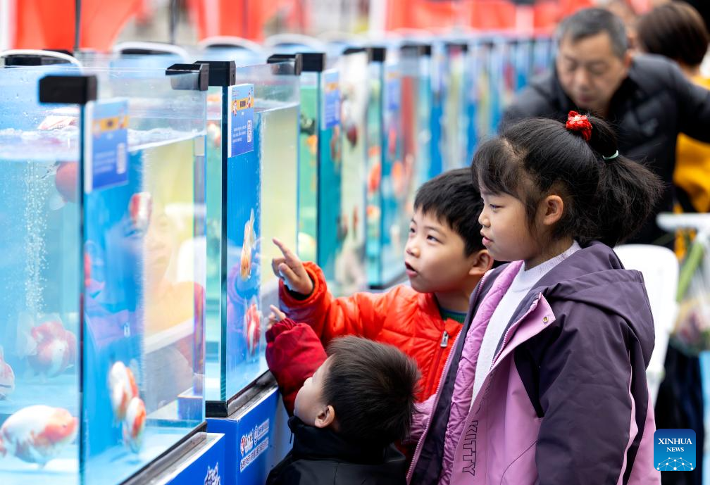 People view goldfish at a park in Fuzhou, southeast China's Fujian Province, Feb. 25, 2026. Fuzhou goldfish cultivation skills, a provincial intangible cultural heritage of Fujian, have been passed down generation after generation, gaining the goldfish variety global fame. (Xinhua/Wei Peiquan)